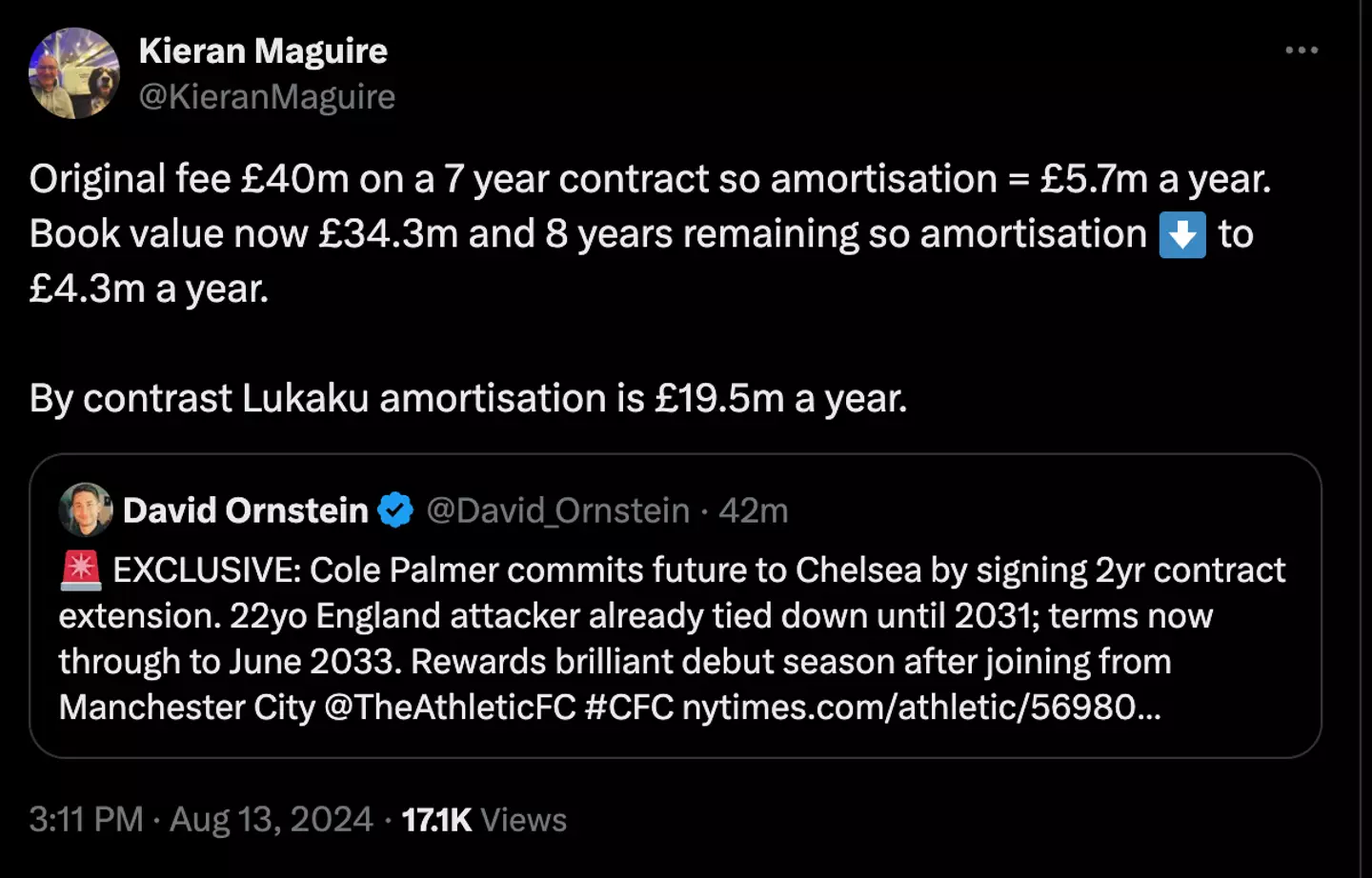 Football finance expert Kieran Maguire has said that the extended deal for Palmer means player amortisation – the amount per year that clubs pay for a player over the course of their contract – can be listed in Chelsea’s accounts as a lower amount.