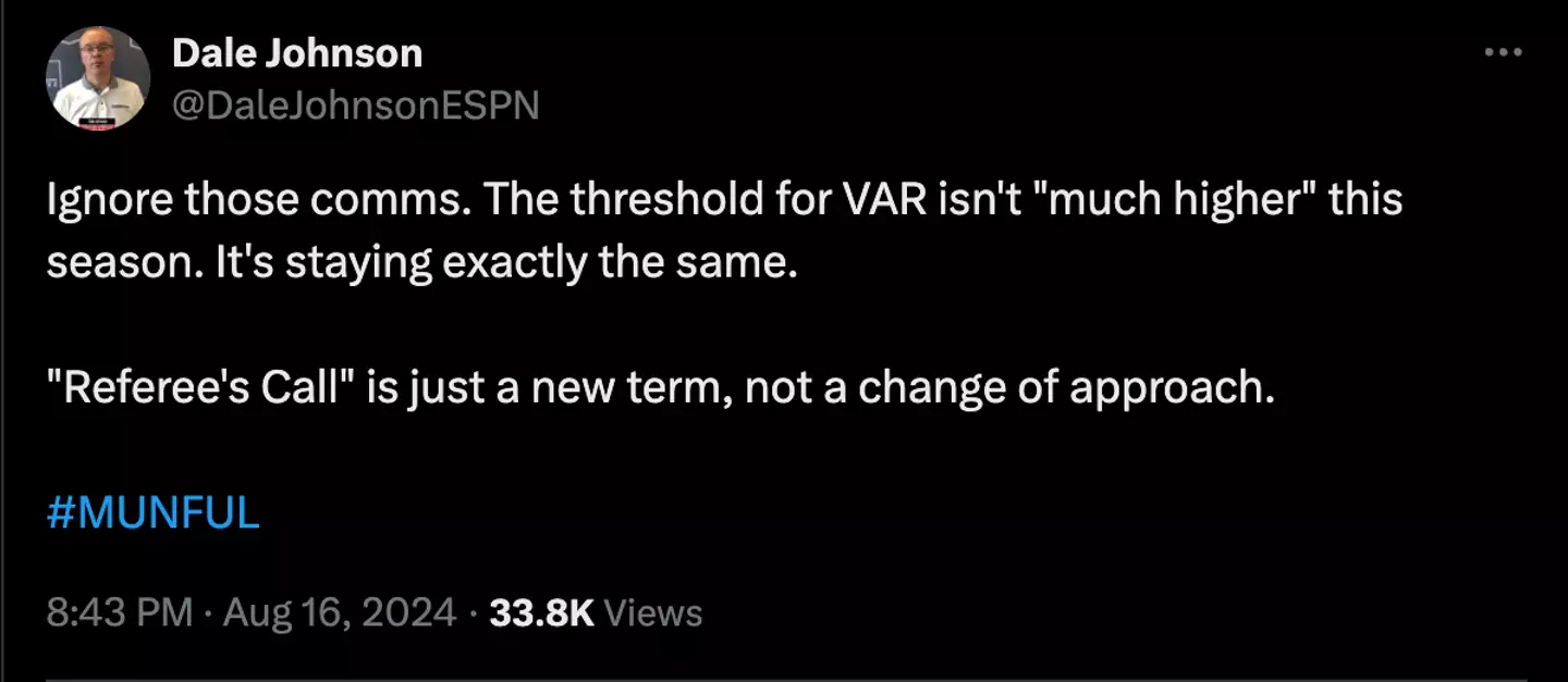 But VAR expert Dale Johnson took issue with the comments, writing on Twitter: “Ignore those comms. The threshold for VAR isn’t ‘much higher’ this season. It’s staying exactly the same.
